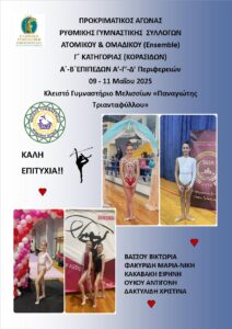 Στον Προκριματικό Αγώνα Ρυθμικής Γυμναστικής Ατομικού και Ομαδικού (Ανσάμπλ) Γ’ Κατηγορίας (Κορασίδων) Α’-Β’ Επιπέδων, Α’-Γ’-Δ’ Περιφερειών θα συμμετέχει ο Ο.Γ.ΗΡ.Α, που θα διεξαχθεί στο Κλειστό Γυμναστήριο Μελισσίων «Παναγιώτης Τριανταφύλλου» (διεύθυνση: Γεννηματά & Σάμου), από τις 09 έως τις 11 Μαΐου 2025.